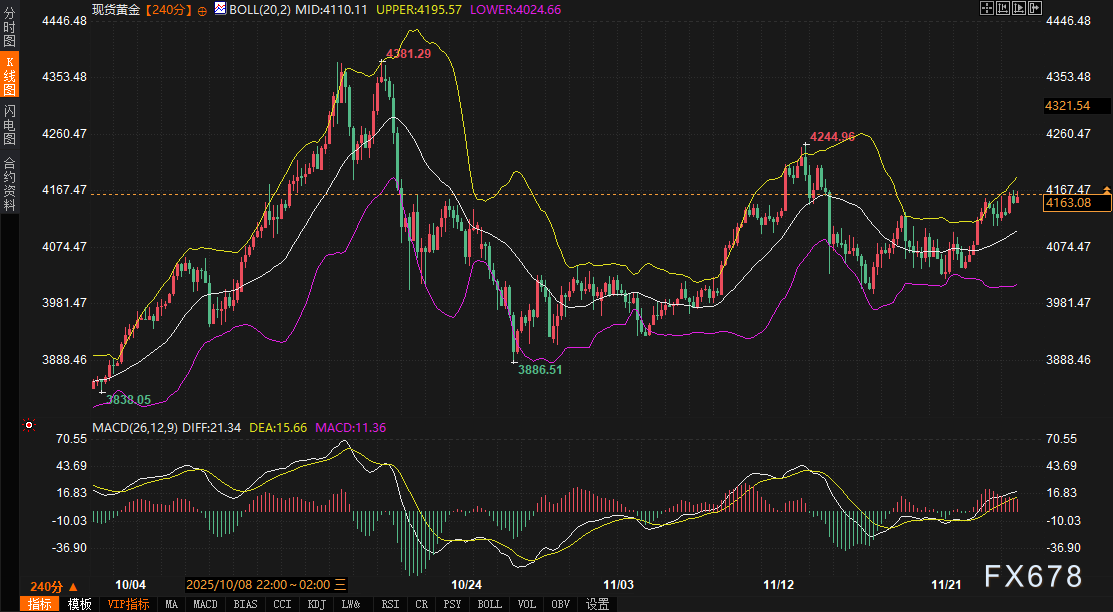 黄金的强势得益于美债收益率回落与避险需求升温。4小时图上,金价已突破布林带上轨(4195.52),中轨(4110.12)与下轨(4024.66)构成动态支撑区间。MACD的DIFF(21.31)大幅高于DEA(15.66),且双线持续上行,显示买盘动能充沛。金价若站稳4150美元,可能上探4200-4220阻力区;若回调,需关注4100-4120支撑强度。