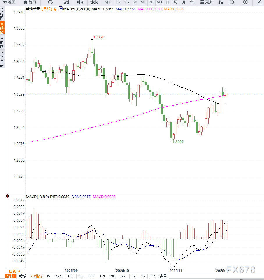 汇通财经APP讯——英镑兑美元在新周开盘呈现温和整理态势,在1.3320附近窄幅波动,但仍仅略低于上周触及的自10月22日以来高点。多头重点关注能否有效站上100日简单移动均线,为下一阶段上行提供确认信号。