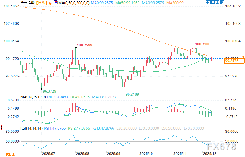 当前美元指数交投于50日移动平均线(99.197)与200日移动平均线(99.439)之间,两条均线乖离率收窄,预示更大级别的行情可能正在酝酿。交易者将99.580视为即时多空分水岭,若指数未能突破该水平,反弹势头或将停滞;若突破200日移动平均线,则标志着多头动能强劲,指数有望上探100.000-100.395区间。反之,若指数回落至50日移动平均线下方,则大概率将测试98.765的震荡低点,并进一步下探98.307-97.814区间。
