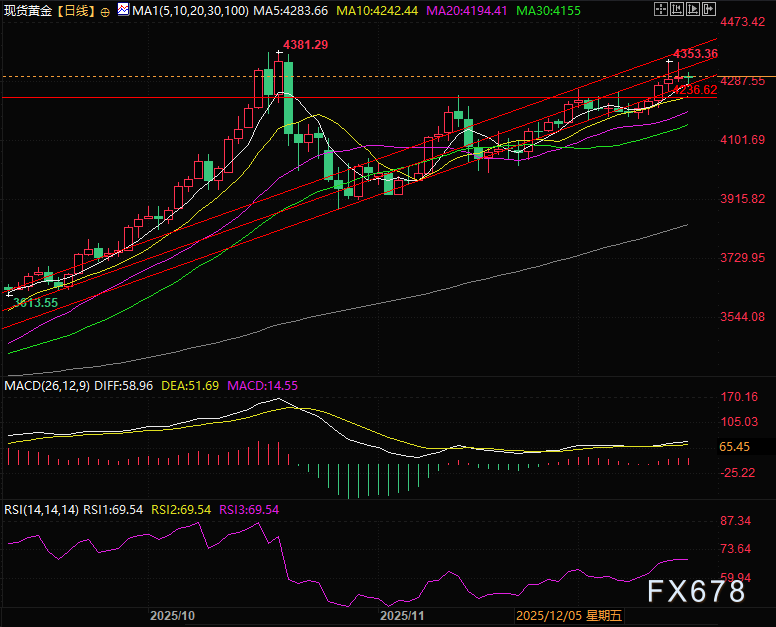 汇通财经APP讯——周二(12月16日)现货黄金维持震荡走势,连续三个交易日走出冲高回落走势,市场在消化各种利空。目前交投于4306.32美元/盎司。